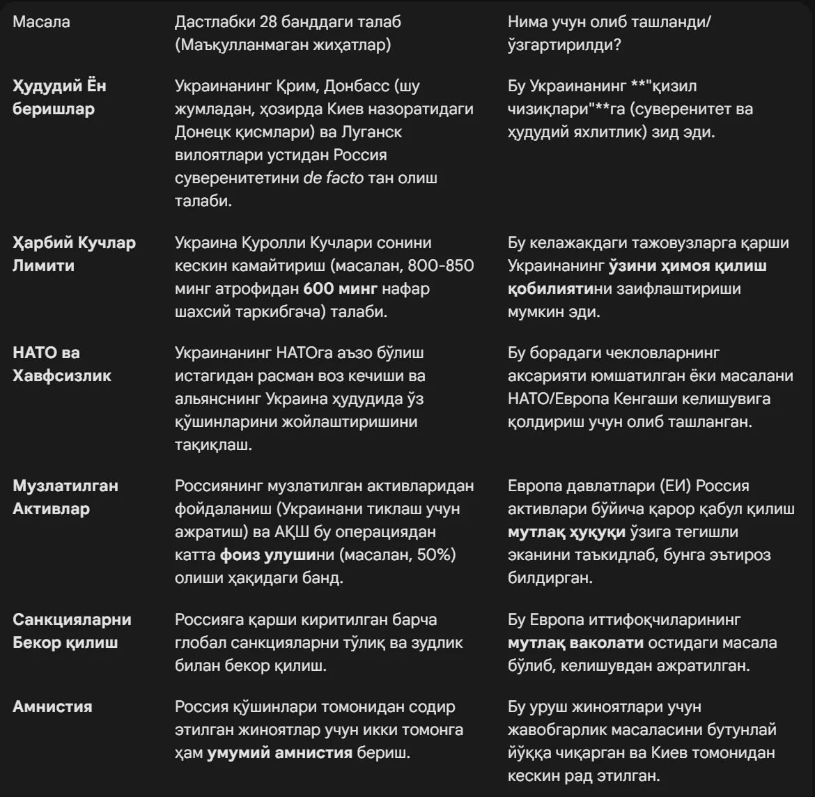 Ukraina tomonining vakili Aleksandr Bevzning so‘zlariga ko‘ra, Kiyevning birorta ham e’tirozi e’tiborsiz qolmagan va "eng muammoli masalalar" bo‘yicha yakuniy qarorlar keyinroq prezidentlar Tramp va Zelenskiy darajasida muhokama qilinadigan bo‘ldi. Bu, aslida, Rossiya uchun eng qulay bo‘lgan talablarning aksariyati dastlabki bosqichdanoq rejadan chiqarib tashlanganini yoki keskin yumshatilganini anglatadi.