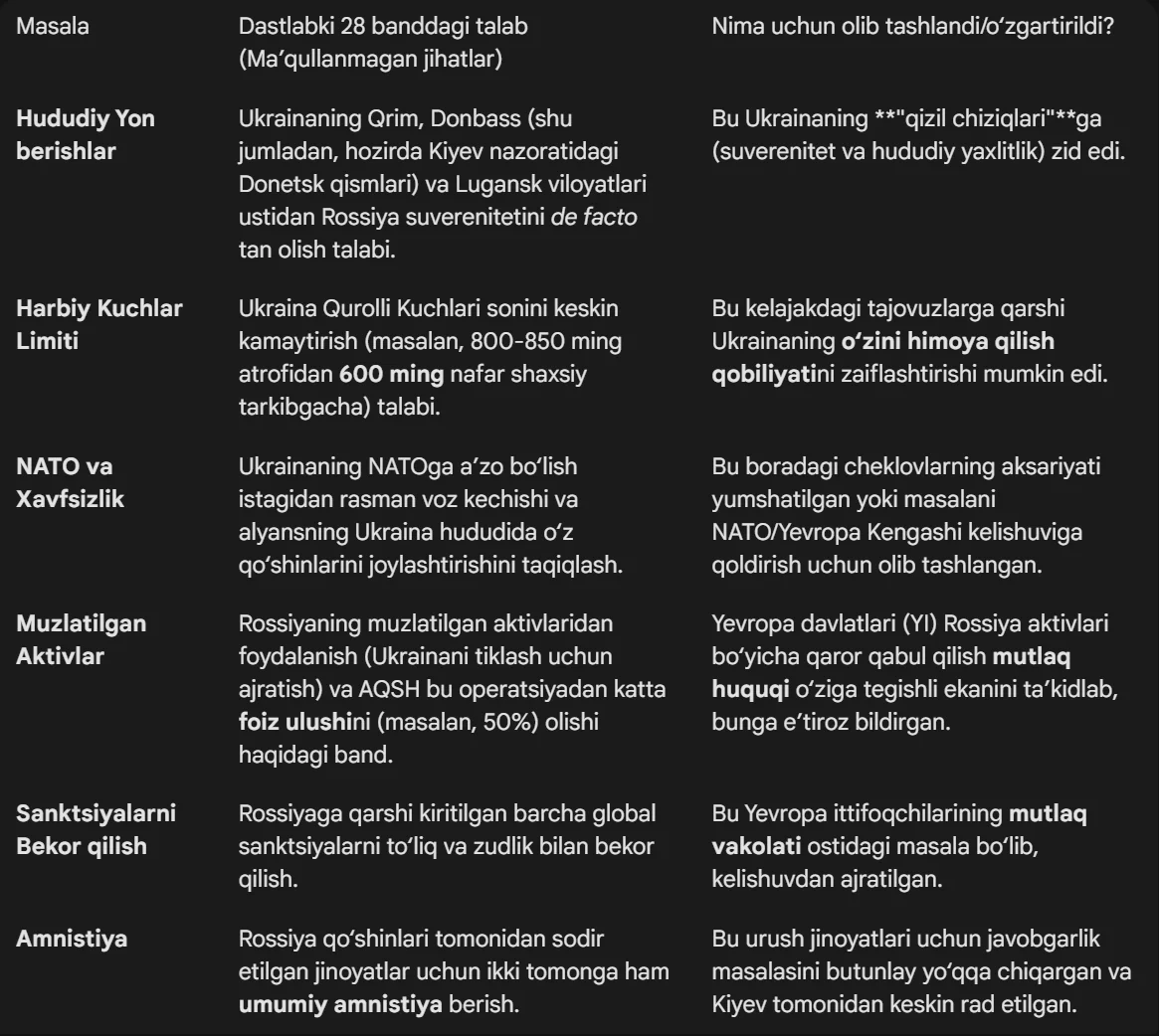 OAV manbalariga ko‘ra, yangi versiyadan eng bahsli bandlar chiqarib tashlangan. ABC News’ning ta’kidlashicha, unda Ukraina qurolli kuchlari sonini qisqartirish va mojaro paytidagi harakatlar uchun to‘liq amnistiya haqidagi talab yo‘q. Shuningdek, Yevropa Ittifoqining qat’iy qarshiligi tufayli Rossiyaning muzlatilgan aktivlaridan faqat 100 milliard dollarni Ukraina tiklanishiga yo‘naltirish haqidagi band ham olib tashlandi. Politico‘ning yozishicha, hududiy masalalar reja dastur doirasidan chetga olingan va ular Tramp va Zelenskiy o‘rtasidagi muloqotga qoldirilgan.