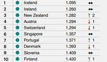Reytingning mutlaq yetakchisi yana bir bor Islandiya bo‘ldi. Bu mamlakat ketma-ket 17-yil davomida dunyodagi eng tinch davlat sifatida o‘z maqomini saqlab kelmoqda. Shuningdek, 2025-yilda eng tinch besh mamlakat quyidagicha shakllangan: