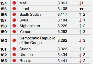 Mutaxassislar bu mamlakatlarda davom etayotgan qurolli to‘qnashuvlar, siyosiy beqarorlik va gumanitar inqirozlar tinchlik darajasiga jiddiy salbiy ta’sir ko‘rsatayotganini qayd etgan.