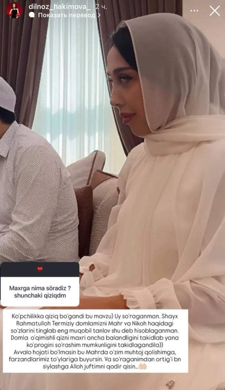“Bu mavzu ko‘pchilikni qiziqtirgan edi. Men mahrga uy so‘raganman. Shayx Rahmatulloh Termiziy domlaning 'Mahr va nikoh' haqidagi suhbatlarini eshitib, bu eng to‘g‘ri tanlov, deb hisoblaganman. Domla aytib o‘tganlaridek, o‘qimishli qizning mahri qimmat bo‘lishi tabiiy ekan. Hatto men yana ko‘proq so‘rashim ham mumkinligini ta’kidlagan edilar.”