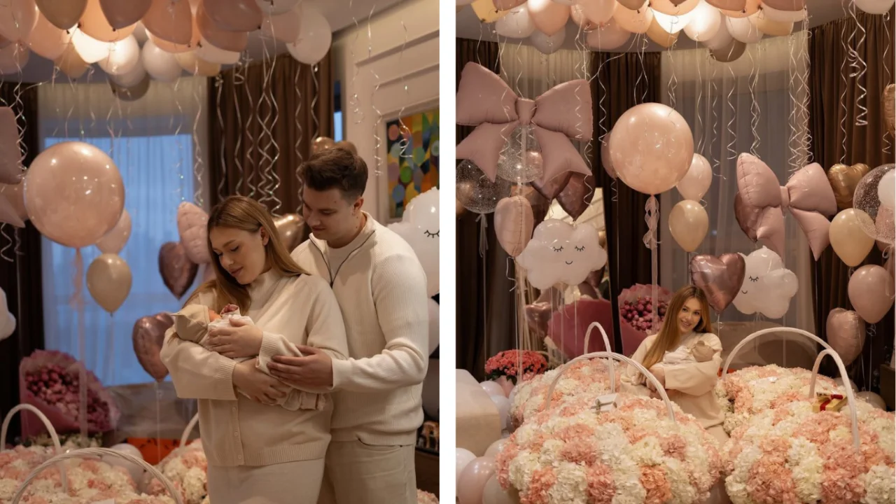 Suratlarda ota-onalar qizaloqni mehr bilan bag‘riga bosmoqda, atrofdagi muhit esa uzoq kutilgan mo‘jizaning bayramona uchrashuvini eslatadi. Xonada ko‘plab gullar, havo sharlari va yumshoq yorug‘lik haqiqiy uy haroratini his qiladi.