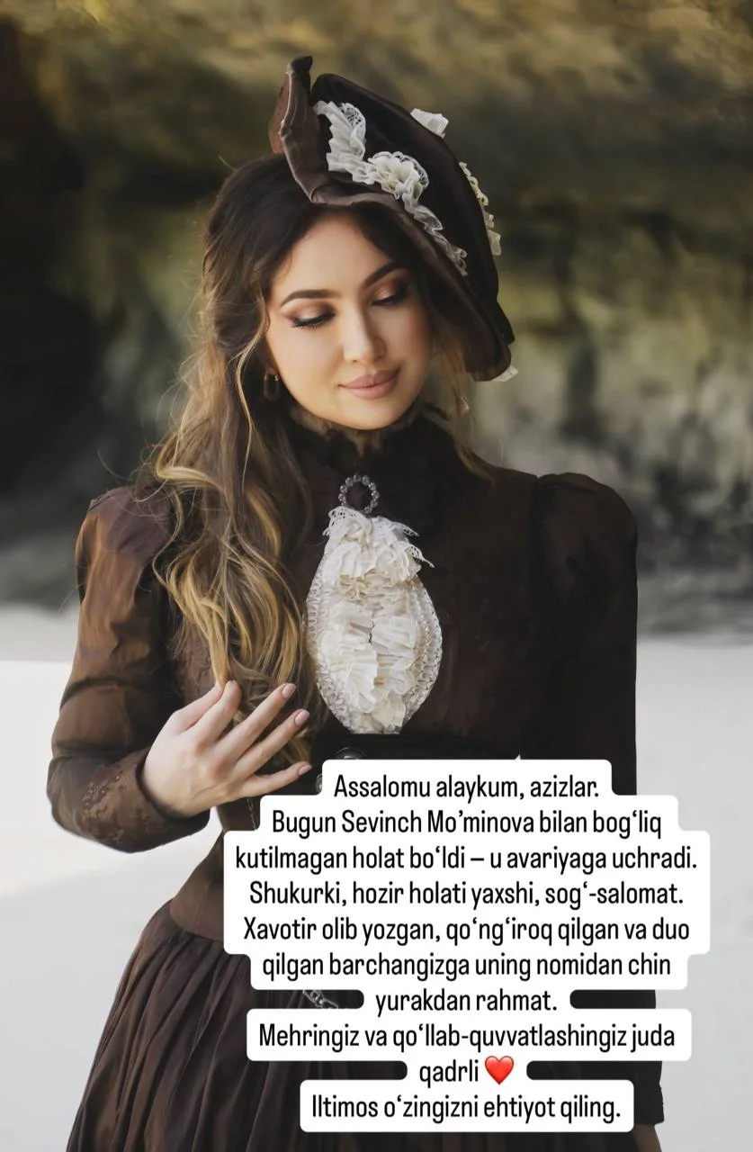 Mashhur xonanda Sevinch Mo'minova yo‘l-transport hodisasiga uchradi. Bu haqda u o‘zining Instagram sahifasi orqali ma’lum qildi.