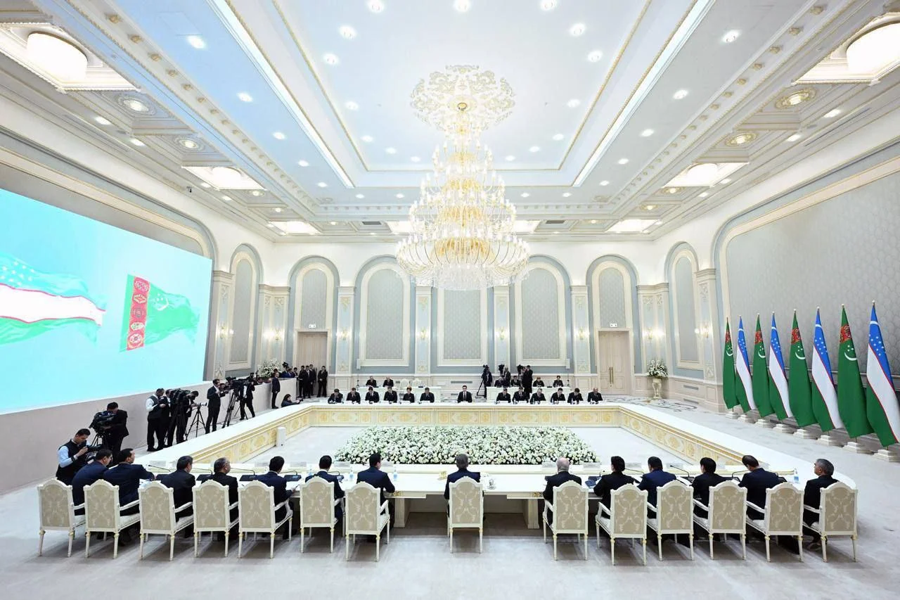 O‘zbekiston prezidenti Shavkat Mirziyoyev va Turkmaniston prezidenti Serdar Berdimuhamedovning muzokaralari Ko‘ksaroy qarorgohida ikki mamlakat rasmiy delegatsiyalari ishtirokida kengaytirilgan tarkibda davom etdi.
