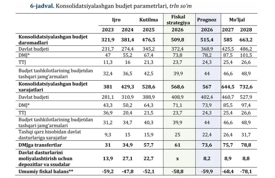 2026-yilda byudjet daromadlari 368,9 trln so‘mga yetishi kutilmoqda (YAIMning 18,7 foizi). Joriy yil prognozi — 345,2 trln so‘m.
