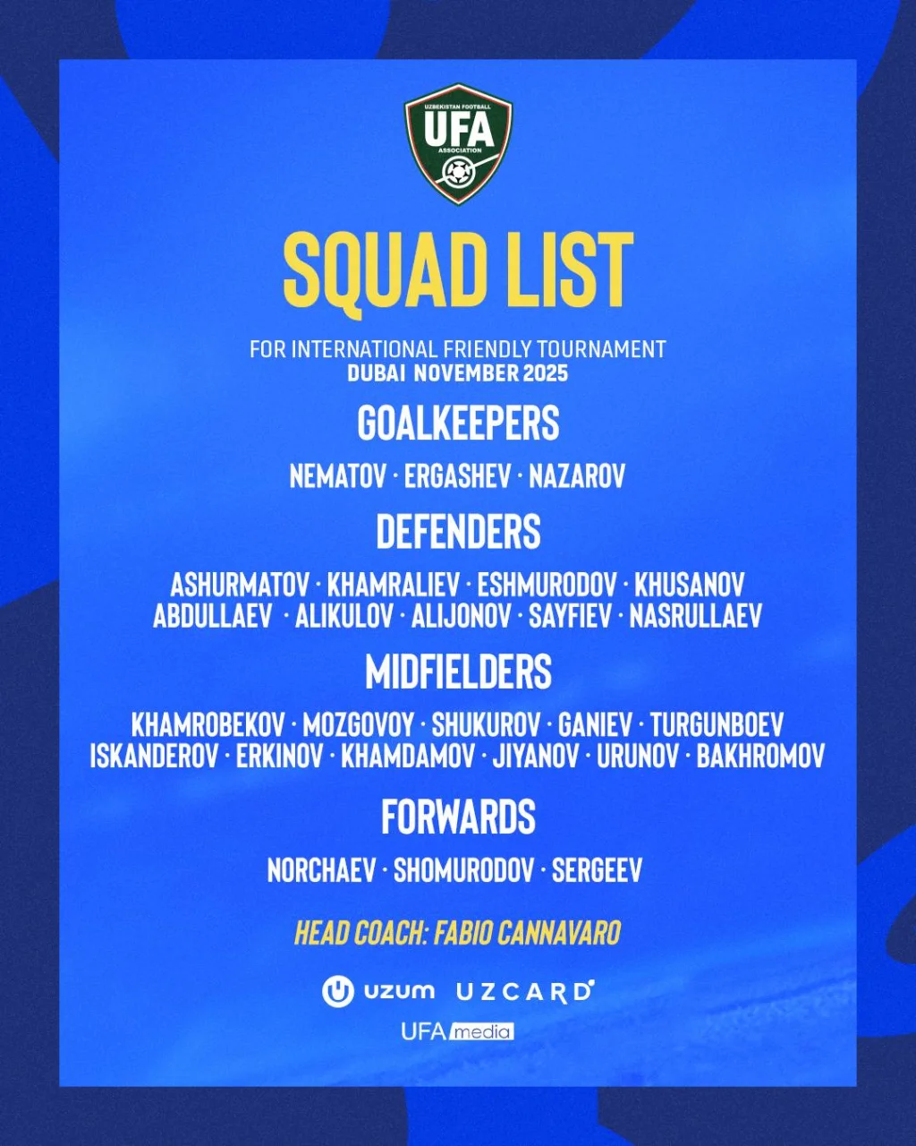 O‘zbekiston milliy terma jamoasi bosh murabbiyi Fabio Kannavaro noyabr oyida Birlashgan Arab Amirliklarida bo‘lib o‘tadigan xalqaro o‘rtoqlik turniri uchun chaqirilgan futbolchilar ro‘yxatini e’lon qildi. Ushbu musobaqa jahon futbolida nufuzli tayyorgarlik maydoni sifatida qaraladi, chunki unda Jahon chempionatida qatnashgan jamoalar — Eron, Misr va Kabo-Verde ham ishtirok etadi.