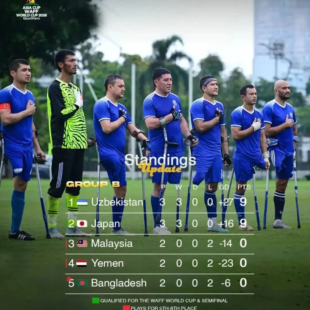 Shu natija bilan O‘zbekiston amputantlar termasi saralash bosqichida 9 ochko jamg‘arib, keyingi yil Kosta-Rikada bo‘lib o‘tadigan Jahon chempionatida qatnashish huquqini qo‘lga kiritdi. Bu natija jamoamizning xalqaro darajadagi nufuzini yanada oshirdi va amputantlar futbolidagi rivojlanish yo‘lidagi muhim qadam bo‘ldi.