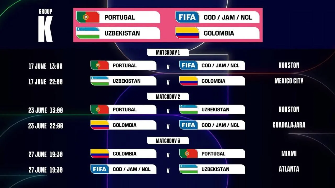 O‘zbekiston terma jamoasi K guruhidan o‘rin oldi. Guruhdagi raqiblar — Yevropaning grandi Portugaliya, Janubiy Amerikaning kuchli jamoasi Kolumbiya va FIFA pley-off g‘olibi (DR Kongo / Yamayka / Yangi Kaledoniya) bo‘ladi. Bu kvartet o‘zining raqobat darajasi bilan e’tiborni tortyapti.