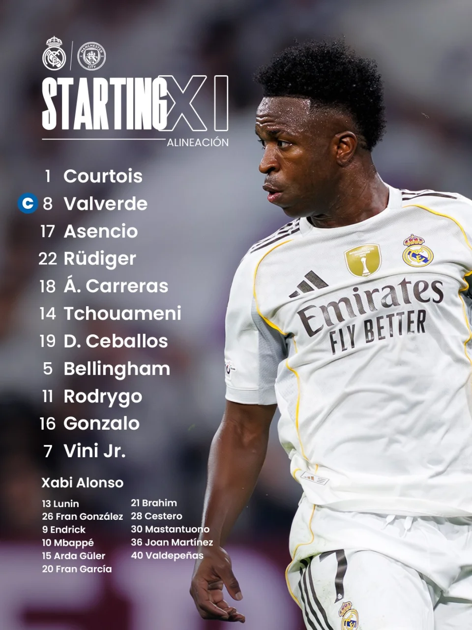 Zaxirada: Lunin, Fran Gonsales, Endrik, Mbappe, Arda Gyuler, Fran Garsiya, Brahim, Sestero, Mastantuono, Joan Martines, Valdepenyas.