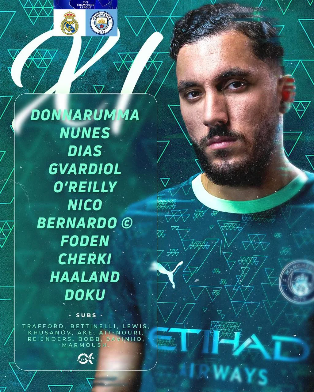 Donnarumma, Nunesh, Diash, Gvardiol, O‘rayli, Bernardo (k), Foden, Niko, Cherki, Xoland, Dok-u.
