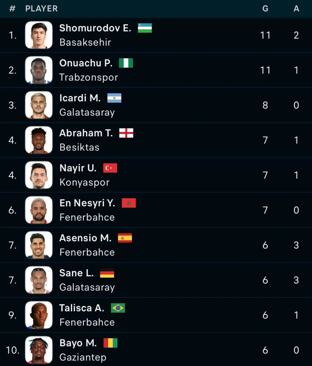 Ayni paytda to‘purarlar ro‘yxatida Eldor Shomurodov birinchi pog‘onada joylashgan. “Trabzonspor” forvardi Pol Onuachu ham 11 ta gol muallifi bo‘lgan, biroq uning golli uzatmalari soni bittaga kam. Shu jihat hamyurtimizning peshqadamligini yanada mustahkamlab turibdi.