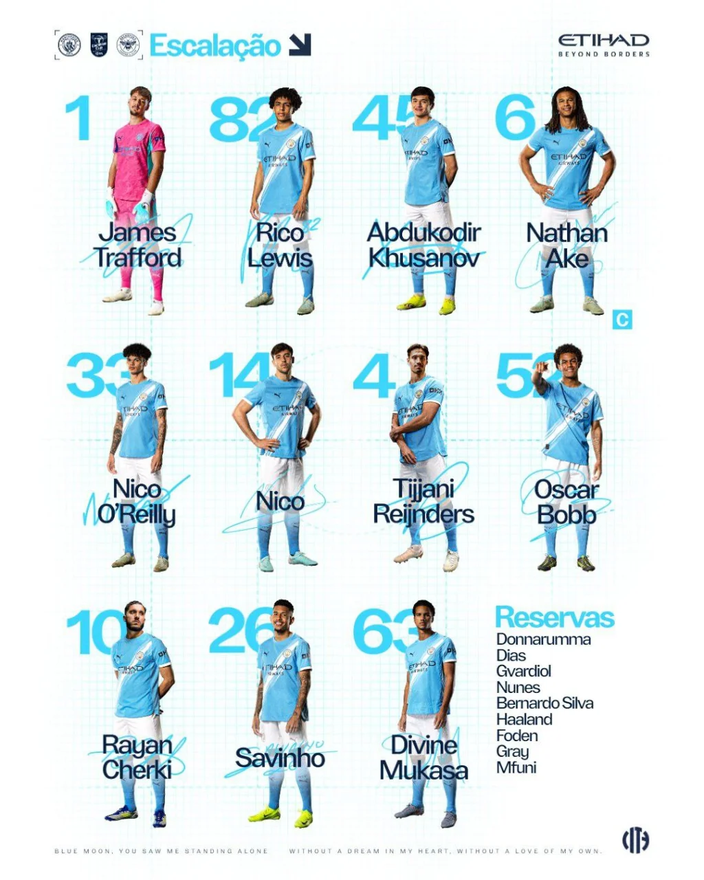 Xosep Gvardiola yarim final kabi muhim o‘yinda yoshlar va tajribali futbolchilarni uyg‘unlashtirgan tarkibni tanladi. Darvozani Jeyms Trafford qo‘riqlaydi. Himoyada Riko Lyuis, Abduqodir Husanov, Natan Ake va Niko O’Rayli joy olgan. Maydon markazida Niko, Tijani Reynders hamda Oskar Bobb o‘yinni boshqaradi. Hujum chizig‘ida esa Rayan Sherki, Savino va Divayn Mukasaga ishonch bildirilgan.