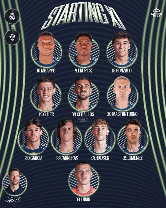 Uchrashuv oldidan «qirollik klubi»ning boshlang‘ich tarkibi e’lon qilindi. Xabi Alonso Kubok o‘yinida ayrim yetakchi futbolchilarga dam berib, bir qator yosh va kam o‘ynayotgan ijrochilarga imkoniyat taqdim etmoqda. Darvozada Andrey Lunin maydonga tushadi. Himoya chizig‘ida Ximenes, Heysen, Karreras va Fran Garsiya joy olgan.